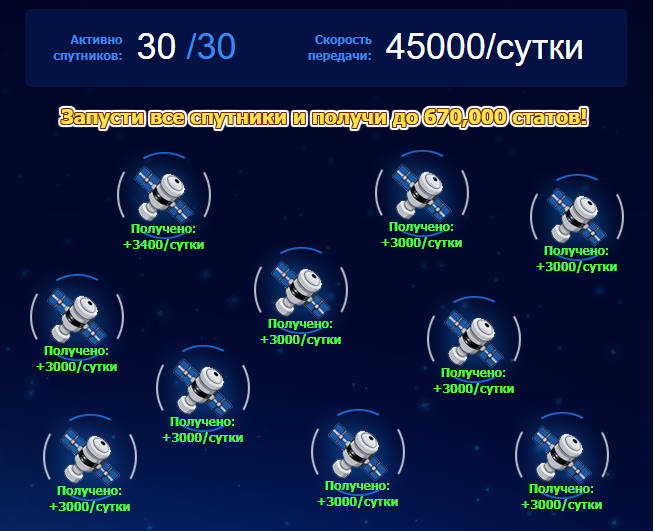 Ведь на последнем круге спутников — скорость прокачки последних спутников увеличена почти в 3 раза! Успей сейчас, чтобы до конца набрать максимум до конца спутников (до 28 августа 2025)!