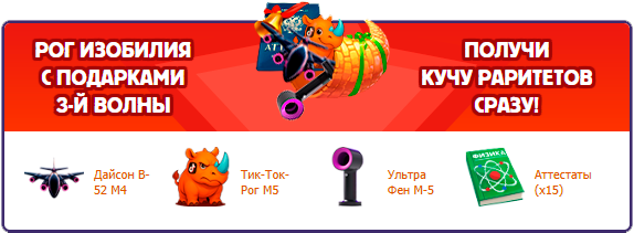 Рог изобилия — это предмет, который содержит в себе все раритеты текущей волны подарков сразу в максимальной модификации и является желанным призом для любого игрока!