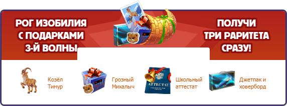 Дополнительный подарок — это дополнительный шанс стать обладателем Рога Изобилия, который содержит в себе 15 аттестатов и все раритеты текущей волны в максимальной комплектации и является самым желанным призом для любого игрока!